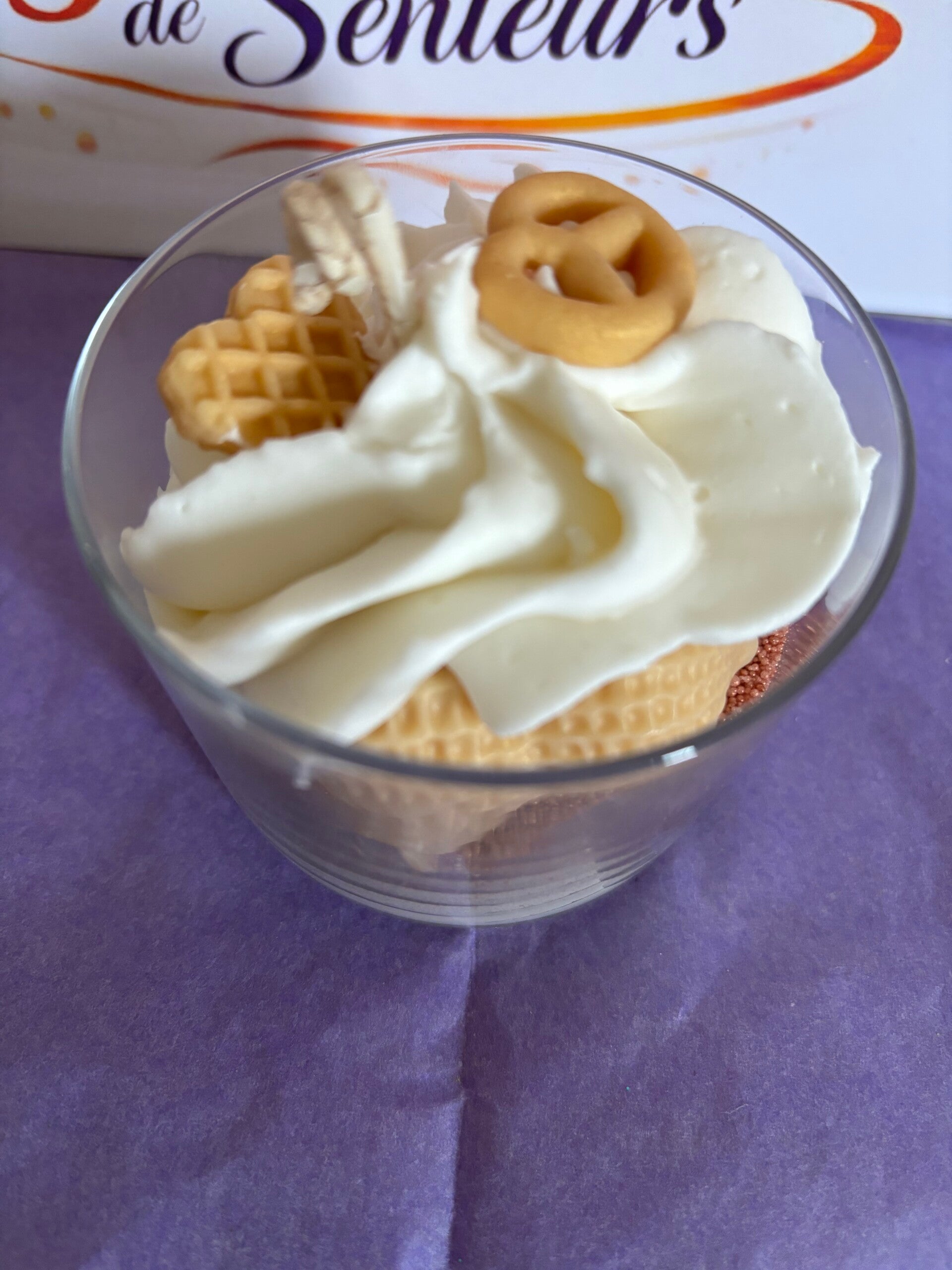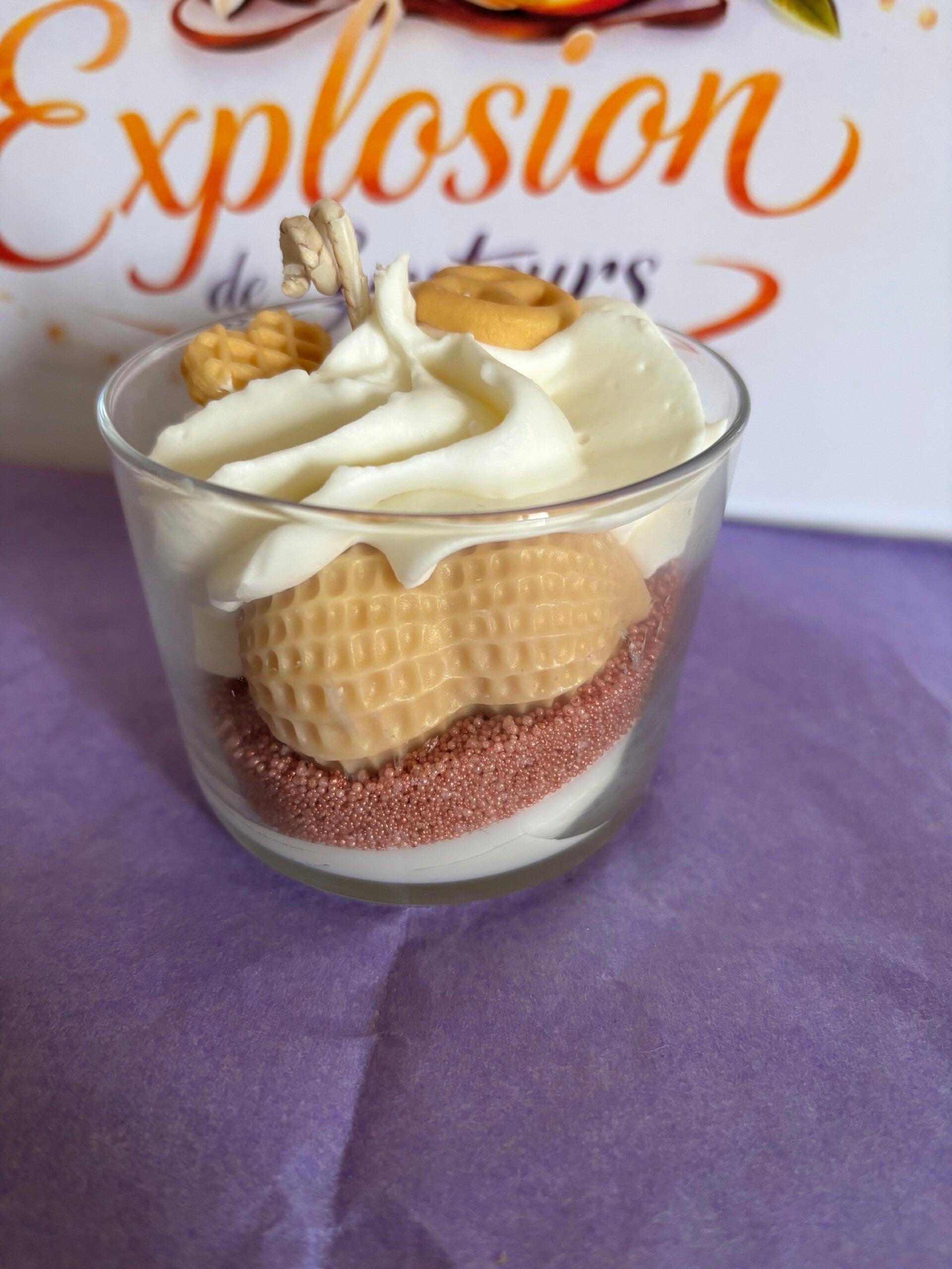 Bougie gourmande lumineuse avec cire 100% végétale. Chaque bougie est unique, fabriquée à la main. La cire utilisée est 100% végétale, VEGAN, sans OGM. Les parfums sont français, viennent de Grasse et sont garantis sans CMR (cancérogène, mutagène, reprotoxique), non toxique. Ingrédients (seulement des bonnes choses) : Cire de soja, parfum de Grasse, colorant naturel. Conseil d'utilisation : coupez la mèche à environ 1cm, vérifiez à ce qu'elle soit toujours centrée, laissez-là se consumer 2 heures au maximum. Photo non contractuelle. Toutes les bougies sont créés à la demande, Informations : Tenir hors de portée des enfants. En cas de consultation d'un médecin, garder à disposition le récipient ou l'étiquette. Produit non comestible.
