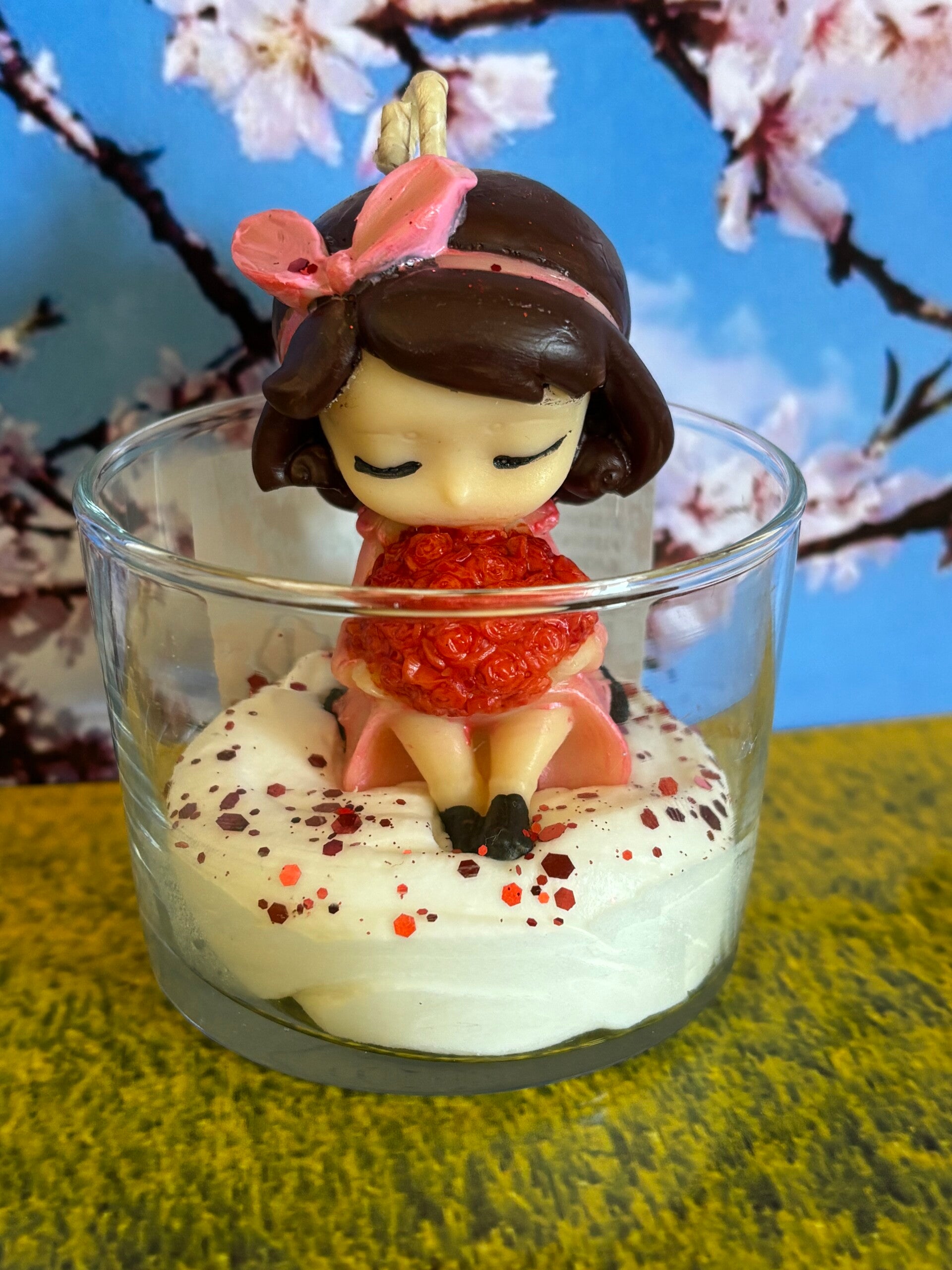 Bougie gourmande lumineuse avec cire 100% végétale. Chaque bougie est unique, fabriquée à la main. La cire utilisée est 100% végétale, VEGAN, sans OGM. Les parfums sont français, viennent de Grasse et sont garantis sans CMR (cancérogène, mutagène, reprotoxique), non toxique. Ingrédients (seulement des bonnes choses) : Cire de soja, parfum de Grasse, colorant naturel. Conseil d'utilisation : coupez la mèche à environ 1cm, vérifiez à ce qu'elle soit toujours centrée, laissez-là se consumer 2 heures au maximum. Photo non contractuelle. Toutes les bougies sont créés à la demande, Informations : Tenir hors de portée des enfants. En cas de consultation d'un médecin, garder à disposition le récipient ou l'étiquette. Produit non comestible.