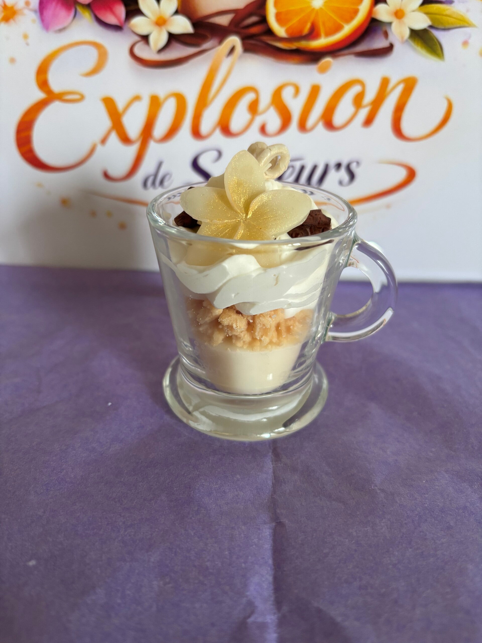 Bougie gourmande lumineuse avec cire 100% végétale. Chaque bougie est unique, fabriquée à la main. La cire utilisée est 100% végétale, VEGAN, sans OGM. Les parfums sont français, viennent de Grasse et sont garantis sans CMR (cancérogène, mutagène, reprotoxique), non toxique. Ingrédients (seulement des bonnes choses) : Cire de soja, parfum de Grasse, colorant naturel. Conseil d'utilisation : coupez la mèche à environ 1cm, vérifiez à ce qu'elle soit toujours centrée, laissez-là se consumer 2 heures au maximum. Photo non contractuelle. Toutes les bougies sont créés à la demande, Informations : Tenir hors de portée des enfants. En cas de consultation d'un médecin, garder à disposition le récipient ou l'étiquette. Produit non comestible.