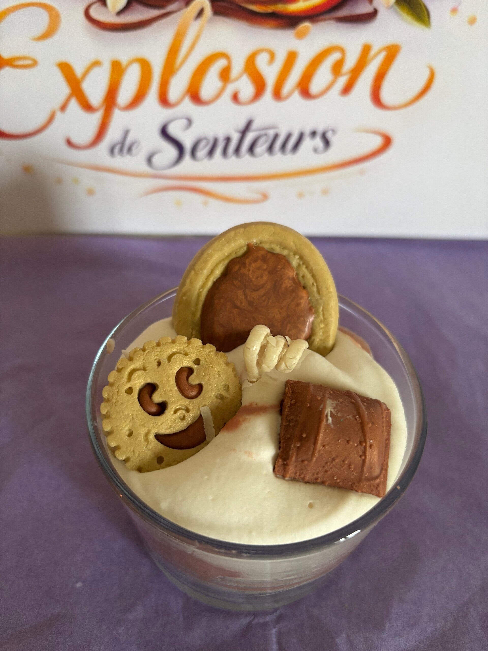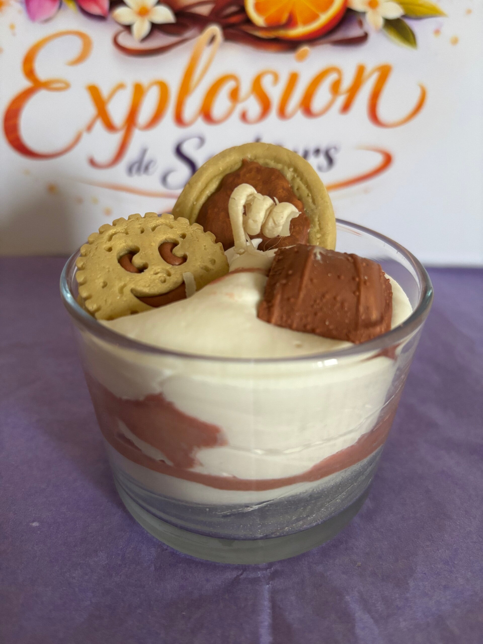 Bougie gourmande lumineuse avec cire 100% végétale. Chaque bougie est unique, fabriquée à la main. La cire utilisée est 100% végétale, VEGAN, sans OGM. Les parfums sont français, viennent de Grasse et sont garantis sans CMR (cancérogène, mutagène, reprotoxique), non toxique. Ingrédients (seulement des bonnes choses) : Cire de soja, parfum de Grasse, colorant naturel. Conseil d'utilisation : coupez la mèche à environ 1cm, vérifiez à ce qu'elle soit toujours centrée, laissez-là se consumer 2 heures au maximum. Photo non contractuelle. Toutes les bougies sont créés à la demande, Informations : Tenir hors de portée des enfants. En cas de consultation d'un médecin, garder à disposition le récipient ou l'étiquette. Produit non comestible.